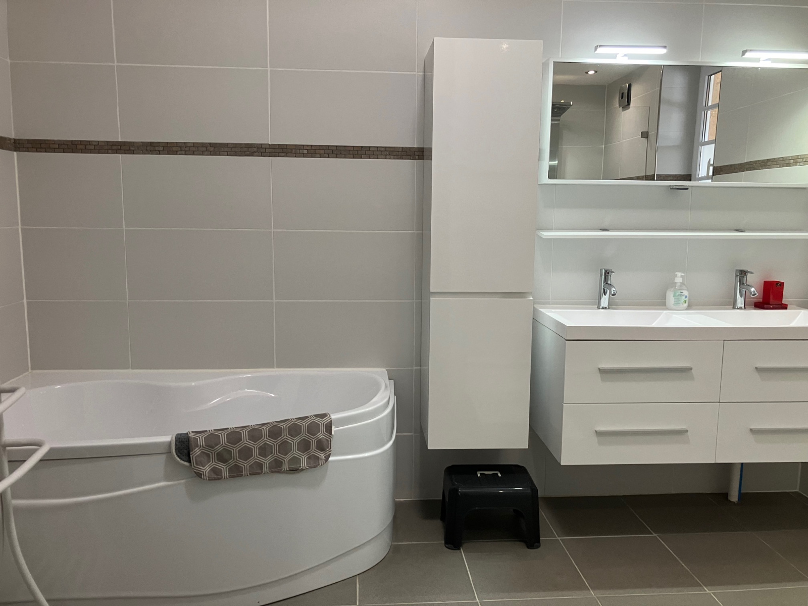 Une salle de bains de 9,53 m², baignoire, douche à l’Italienne, 2 vasques sur meuble, WC, sol carrelage.