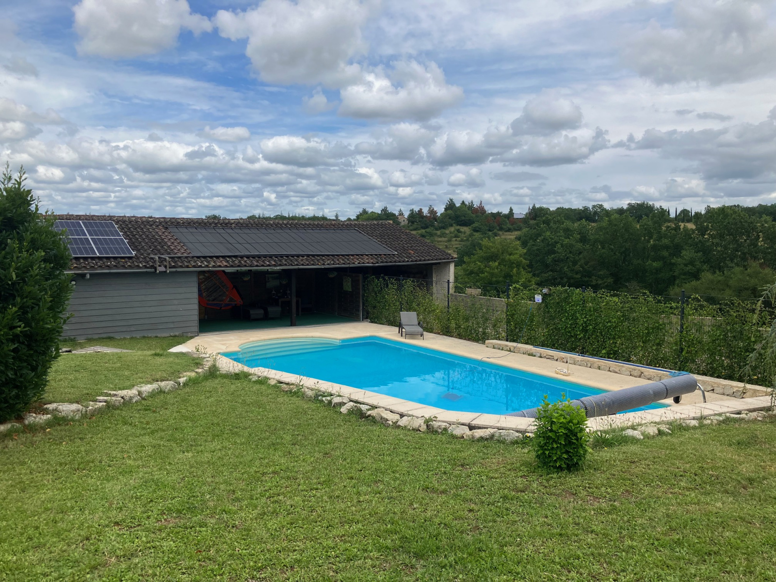 Une piscine chauffée par panneaux solaire au sel de 10m x 5m avec liner, escalier roman et plages dallées en pierre reconstituée.
