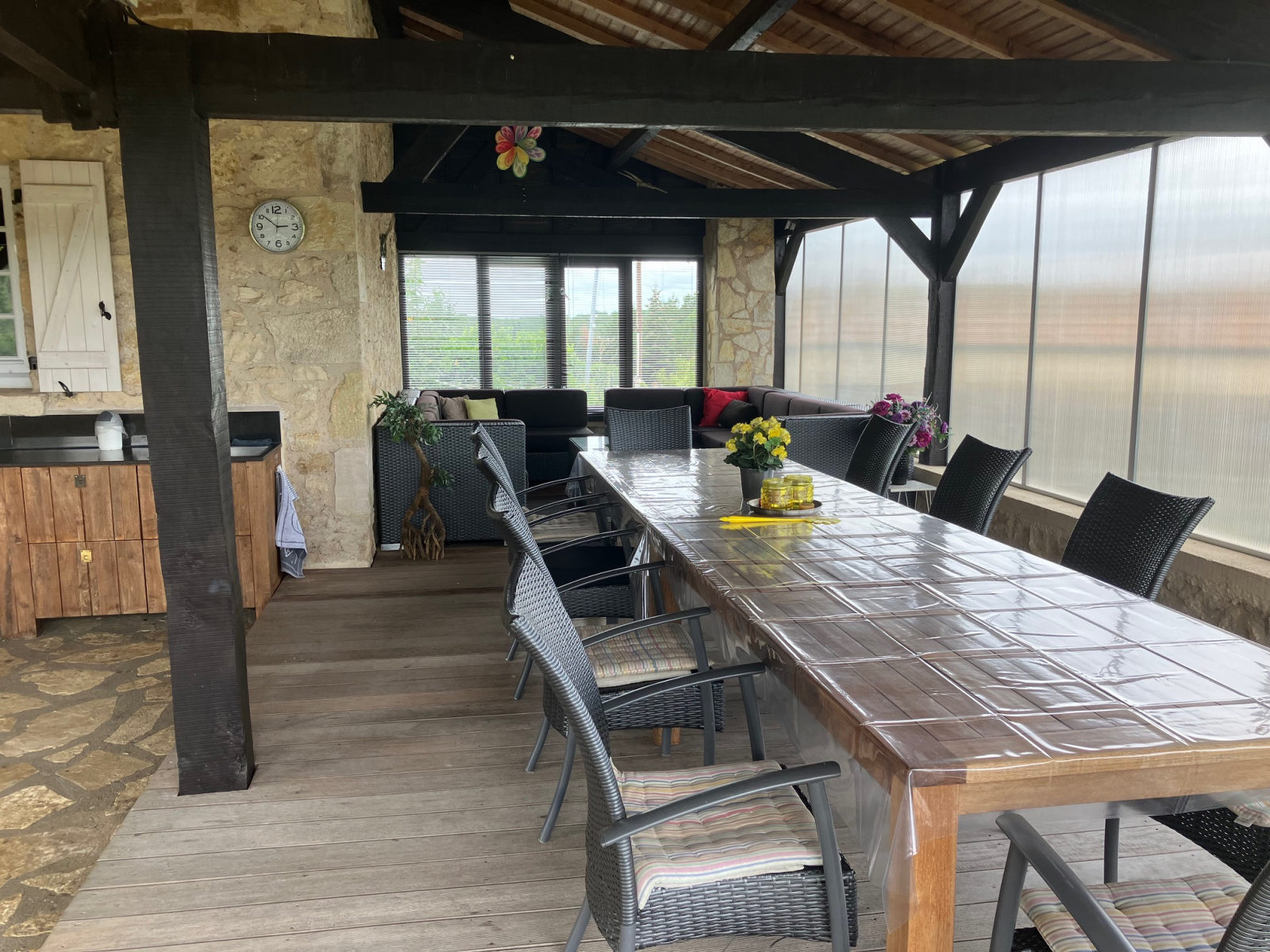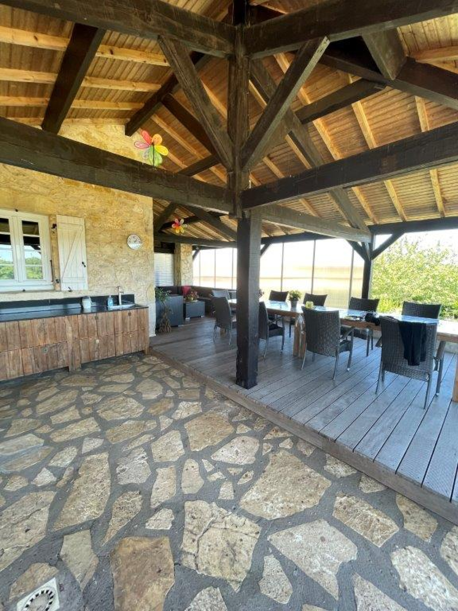 Rez de chaussée : 1 grande terrasse dallée en pierre en partie couverte avec cuisine d’été, offrant la vue.