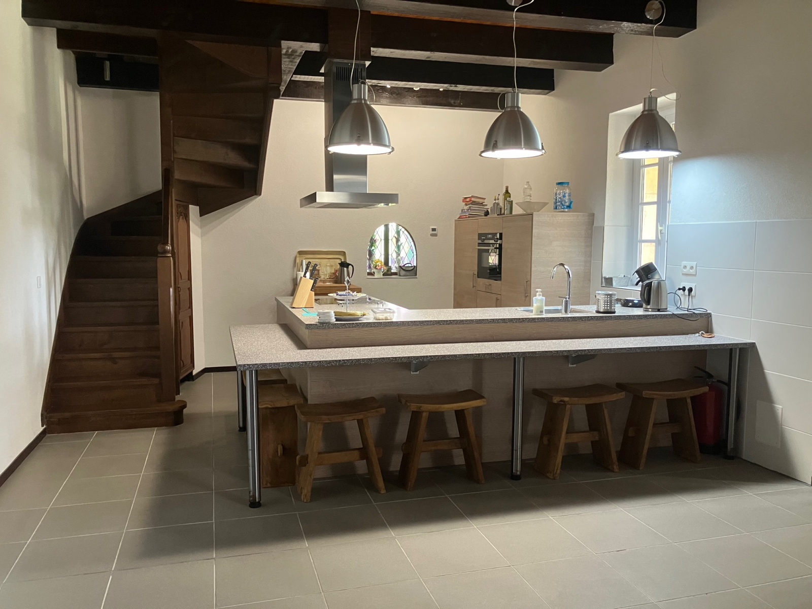 Une cuisine de 19,5 m² aménagée avec meubles bas, bar, évier, appareils ménagers, poutres apparentes, sol carrelage.
